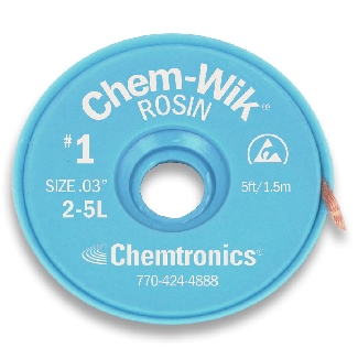 The Chemtronics 2-5L desoldering braid (solder wick) is a rosin-flux copper braid made for safely removing solder from circuit boards and electronic components. Its fine weave and narrow width make it especially suitable for delicate, heat- or static-sensitive work.