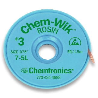 Chemtronics 7-5L is a rosin-flux desoldering wick (also called solder braid) used to remove solder from circuit board pads, component leads, and joints. It uses fine copper braid with rosin flux to wick away solder quickly and cleanly, minimizing heat exposure to sensitive components.