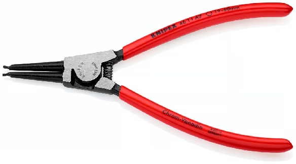 The Knipex 46 11 A2 Circlip Pliers are professional-grade tools engineered for precise installation and removal of external circlips on shafts ranging from 19 mm to 60 mm in diameter. Designed with solid, straight tips forged as part of the pliers, they offer superior strength and reliability. Crafted from high-quality chrome vanadium electric steel, these pliers are oil-hardened and finished with a corrosion-resistant black atramentizing. Ergonomic plastic-coated handles ensure comfortable handling during extended use, making them ideal for demanding environments.
