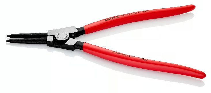 The Knipex 46 11 A4 Circlip Pliers are heavy-duty tools designed for precise installation and removal of external circlips on shafts ranging from 85 mm to 140 mm in diameter. Built with solid, straight tips forged directly with the tool body, these pliers offer superior strength and durability. Crafted from chrome vanadium electric steel, forged and oil-hardened, they deliver long-lasting reliability for industrial and mechanical applications. The tool features a black atramentized finish for corrosion resistance and plastic-coated handles for secure and comfortable handling.