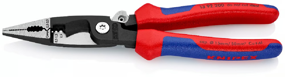 The KNIPEX 13 92 200 Pliers for Electrical Installation are a high-precision, multi-functional tool designed for the modern electrician. These pliers combine six essential functions—gripping, bending, deburring, cutting, stripping, and crimping - into a single compact and durable tool. With a slim head and intelligent latching mechanism, they provide easy access to confined spaces and improve efficiency on the job. Built with German engineering standards, these pliers deliver professional-grade performance and long service life.