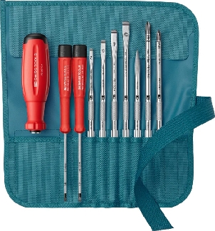 The PB Swiss 38218.PE is a professional 9-piece screwdriver set featuring a SwissGrip Evo handle and interchangeable blades for both slotted and Phillips screws. Designed for versatility and precision, it comes in a compact roll-up textile case, ideal for mobile technicians and workshop use.