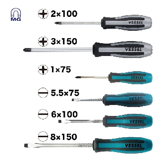 The VESSEL MEGADORA 6-Piece Screwdriver Set (Model 9006HS) is built for precision and strength and is best suited for automotive repair and general fastening applications. The set incorporates the groundbreaking JISDRIVE tip, which snaps securely into screw heads, providing additional torque and minimizing slippage. The knurled shank also offers a non-slip grip for finger tightening and allows enlarging holes in wood.