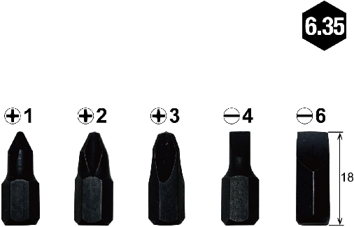 *Contents: Phillips bits: No.1, No.2, No.3; Slotted bits: 4mm, 6mm; Bit holder