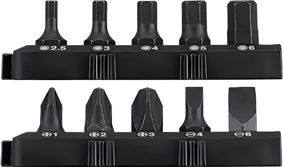 *Contents: Phillips bits: No.1, No.2, No.3; Slotted bits: 4mm, 6mm; Hex bits: 2.5mm, 3mm, 4mm, 5mm, 6mm; Bit holders: 2