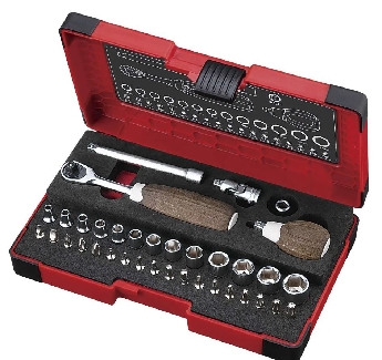 The VESSEL WOOD-COMPO Socket Wrench Set No. HRW2001M-W is a high-quality 36-piece toolset designed to be versatile, long-lasting, and comfortable. Featuring an innovative wood-composite handle, the set offers a superior non-slip feel—perfect for delicate and secure grip in oily, greasy, or wet environments. The slim wedge ratchet head for easy use in cramped spaces and the complete set of sockets, bits, and accessories provide versatile applicability across various automotive, electronics, and mechanical uses.